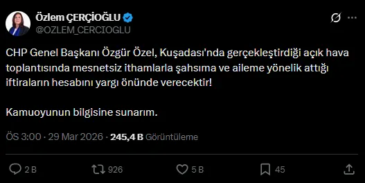 Çerçioğlu, yaptığı açıklamada, Özel’in sözlerinin mesnetsiz olduğunu öne sürerek, “CHP Genel Başkanı Özgür Özel, Kuşadası'nda gerçekleştirdiği açık hava toplantısında mesnetsiz ithamlarla şahsıma ve aileme yönelik attığı iftiraların hesabını yargı önünde verecektir! Kamuoyunun bilgisine sunarım” ifadelerini kullandı.